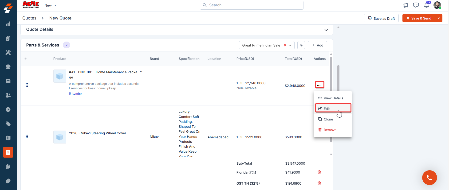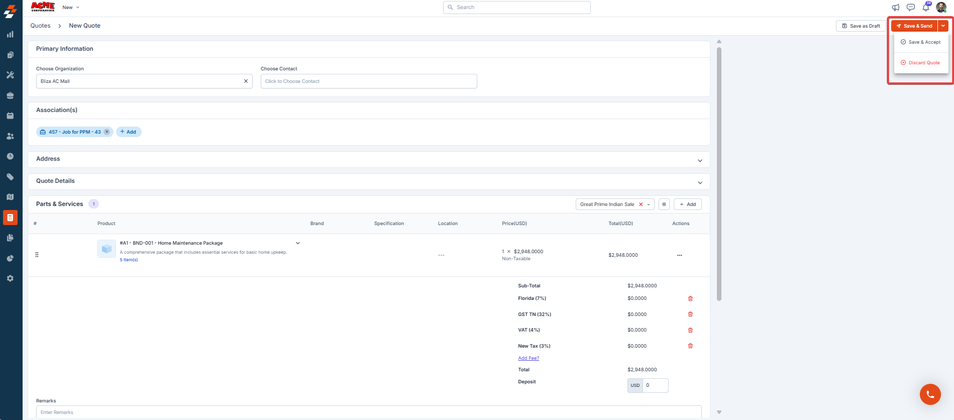 - After adding parts and services to the quote, transactional discounts and global taxes will be applied.