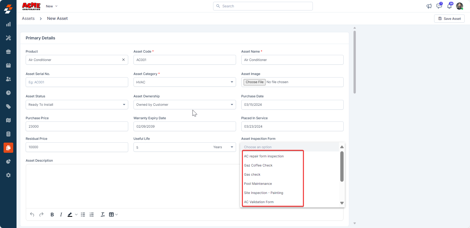 - Assets -> Asset Listing page -> + New Asset -> Asset Inspection Form