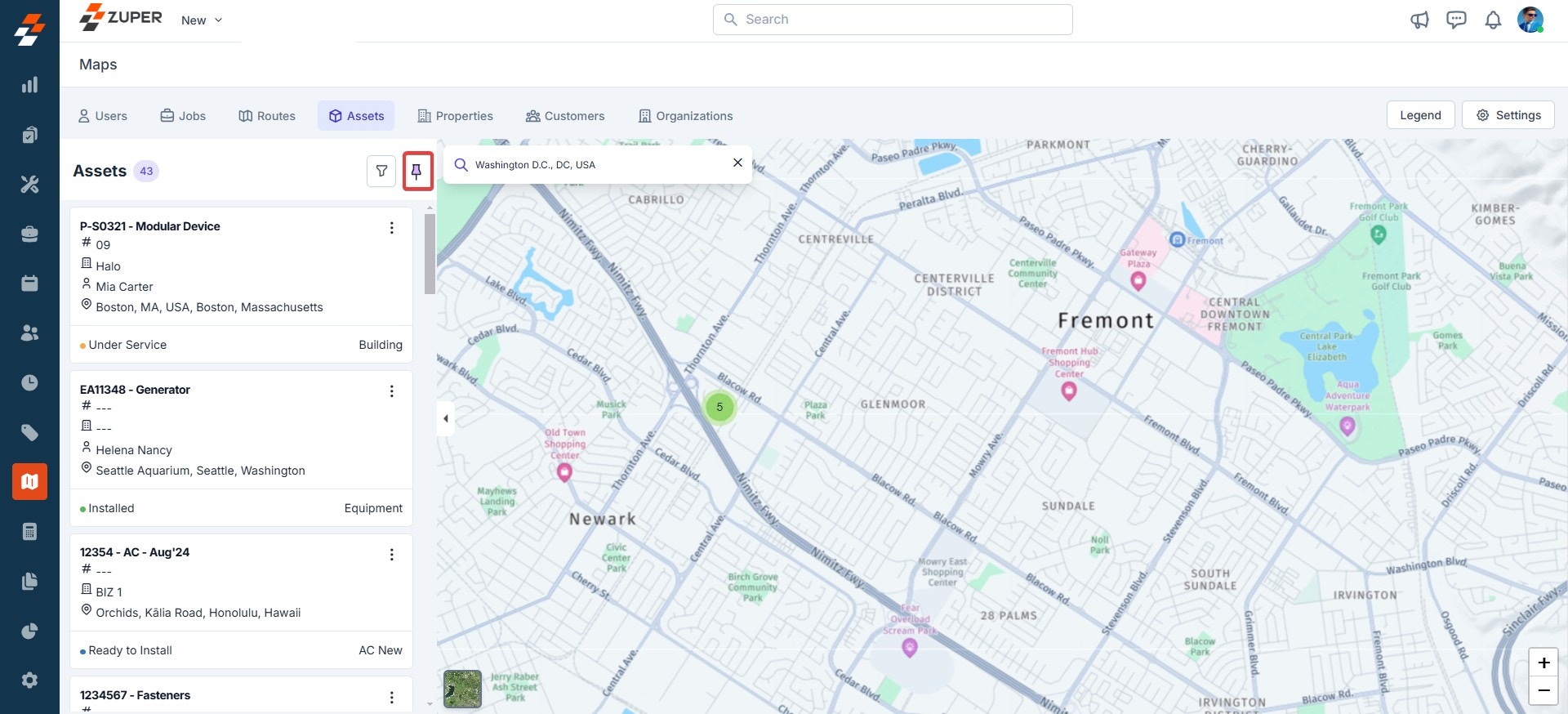 Note: When an asset module is pinned, its location appears in all other selected modules on the map. When unpinned, it does not appear in different modules.