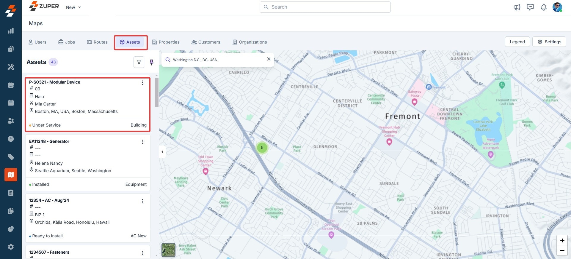 - Click any asset to view its location on the map. You can use the zoom-in and zoom-out icons to adjust the map view.