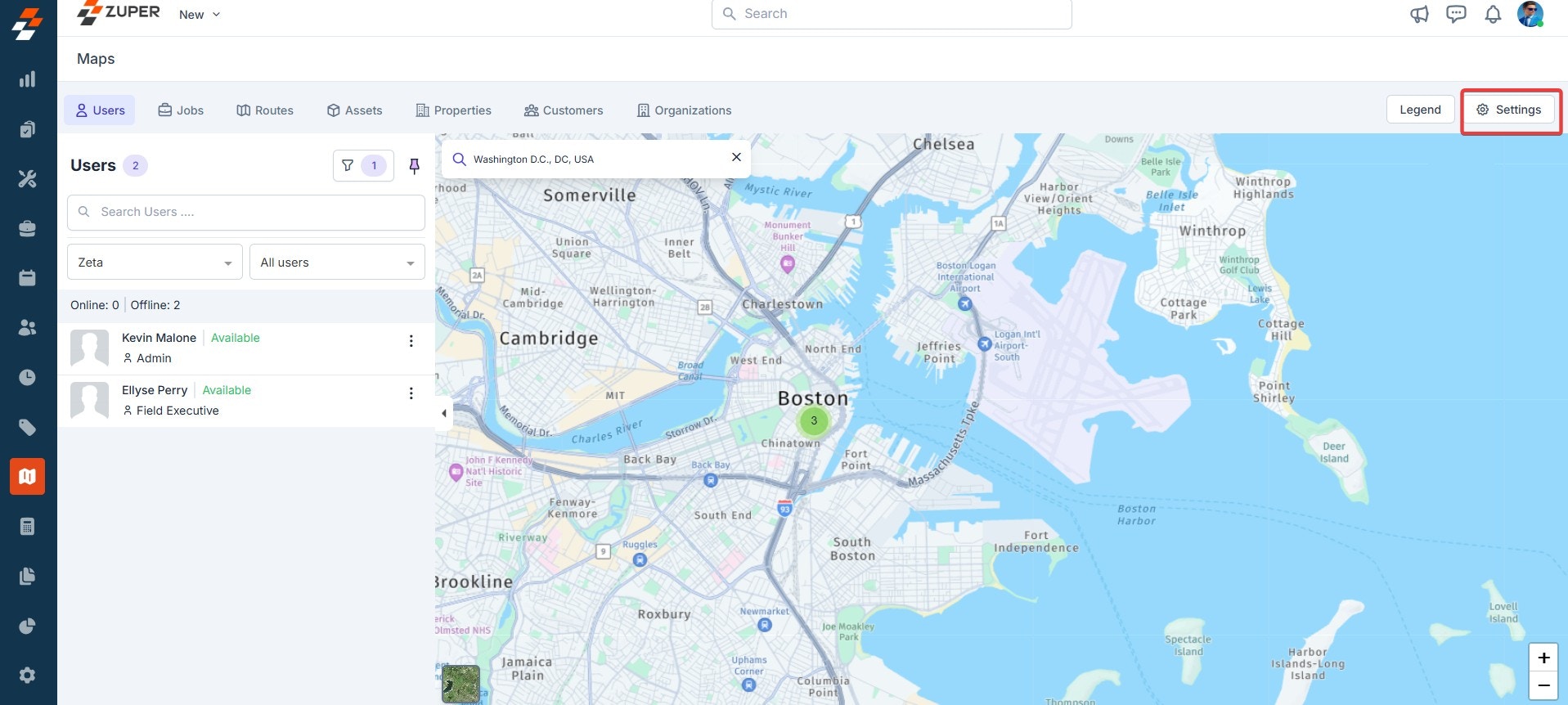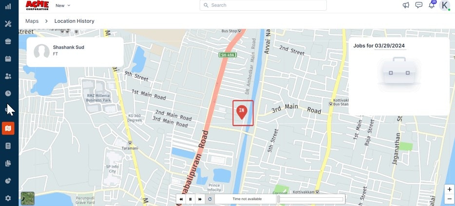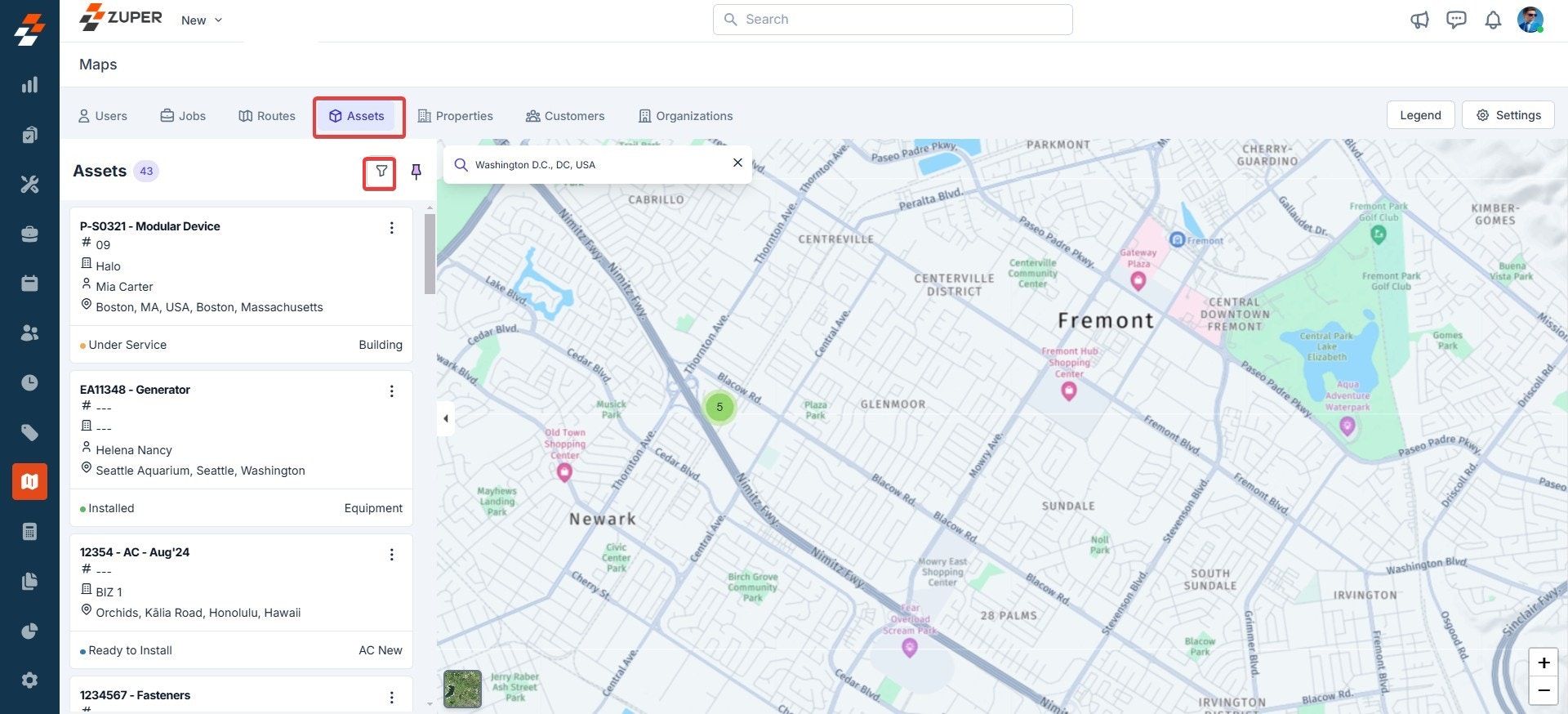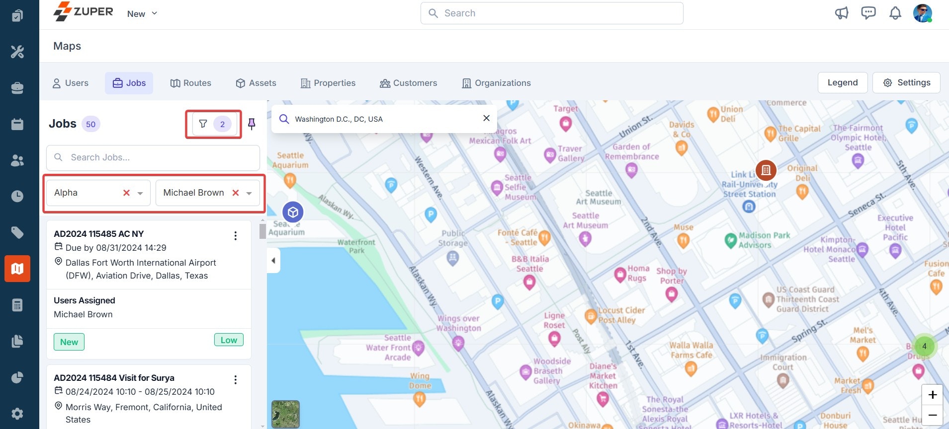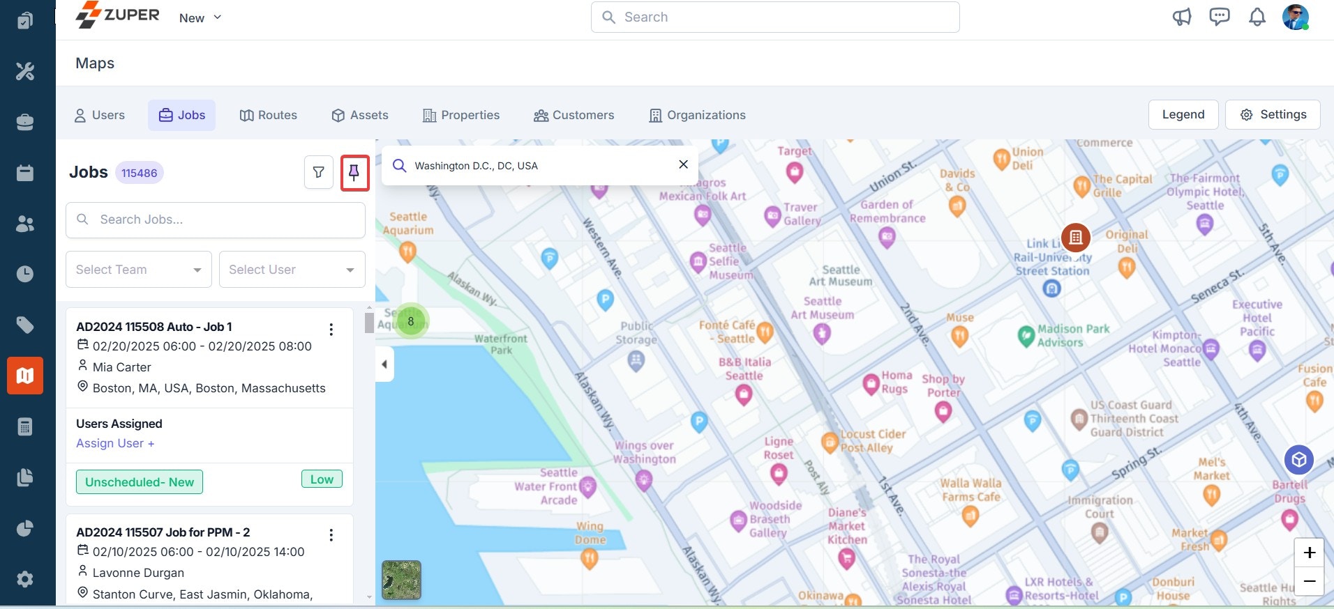 - You can also search and view job locations on the map. To do so, click the “Filter” icon to search for a job based on the team and user.