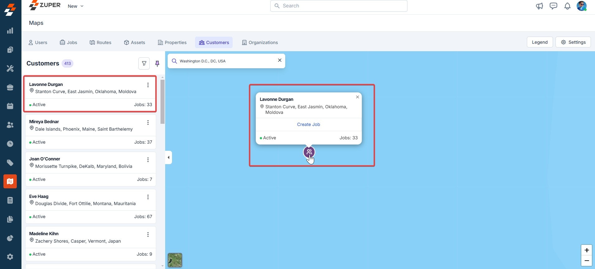 To track the exact location of the customer on the map, follow these steps:- On the maps page, click “Customers” at the top, which lists all the customers created. Click any customers to view their exact location on the map. You can use the zoom-in and zoom-out icons to adjust the map view.