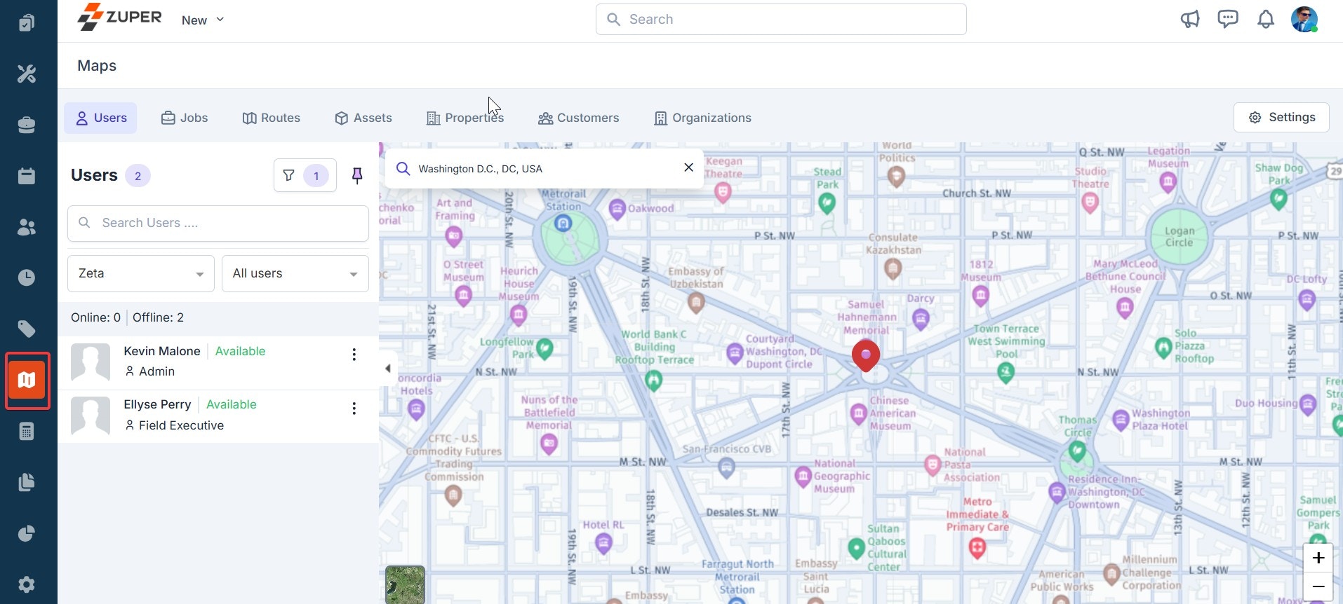 - Click any user to view their exact location on the map. You can also search for and view specific users on a team. Click the filter icon to search for a user based on the chosen team and user type (online and offline).