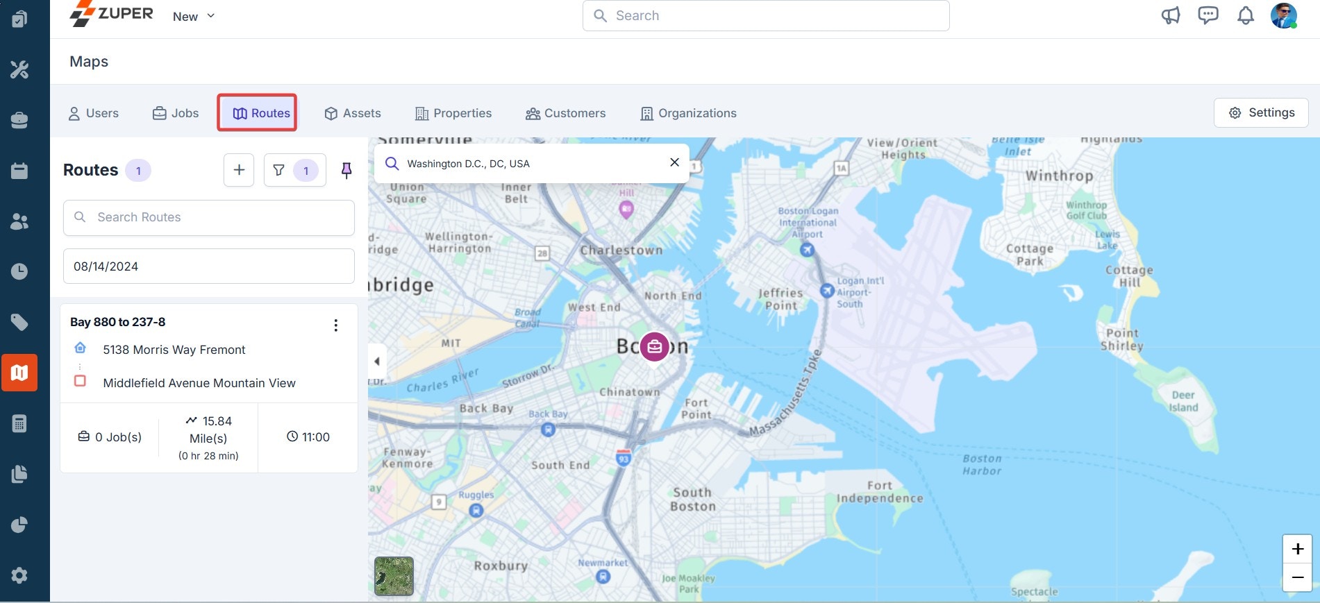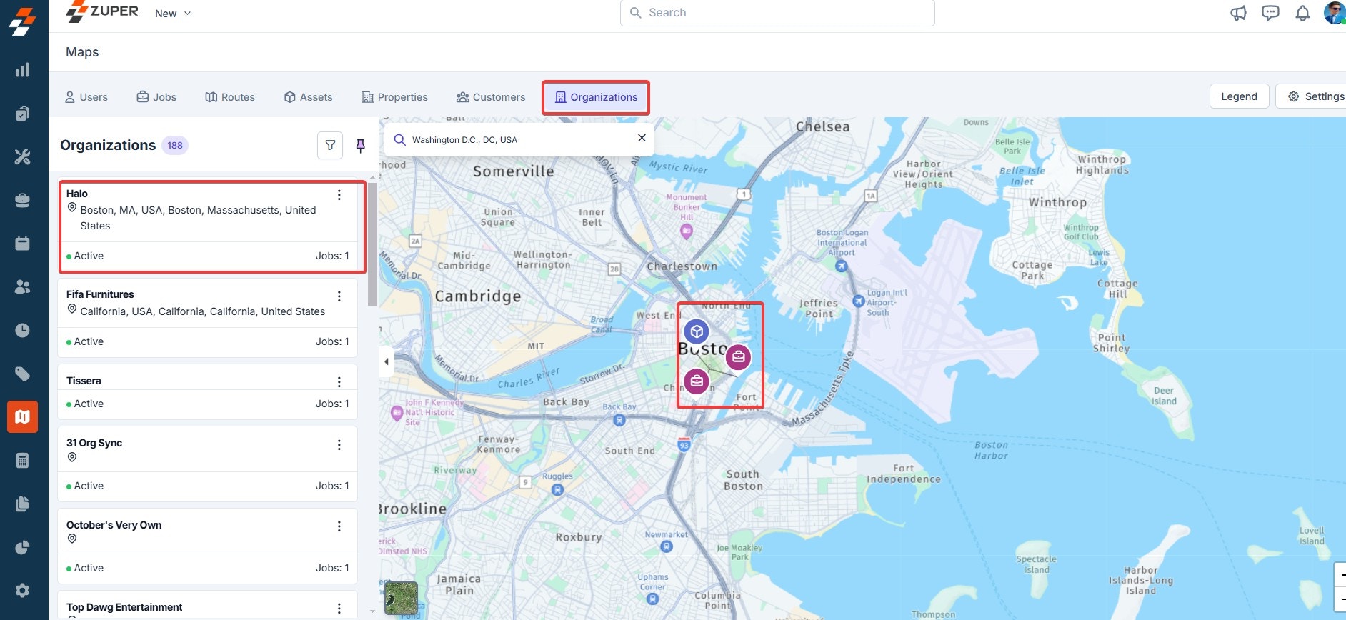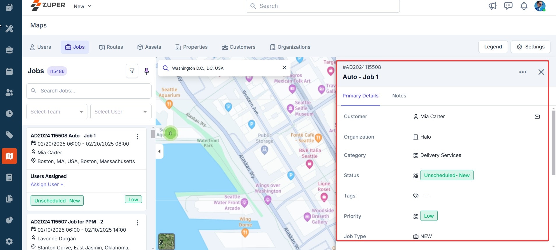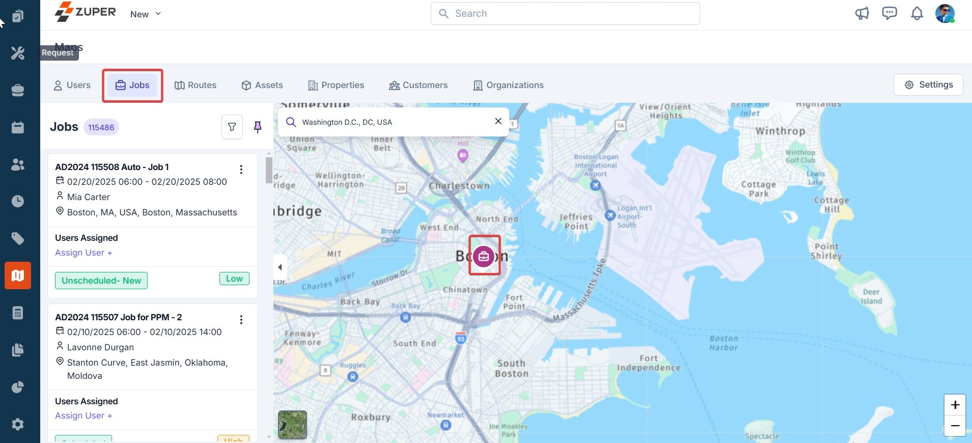 To track the exact location of the jobs on the map, follow these steps:- Click “Jobs” at the top of the maps page. This will list all the jobs with information such as user assigned, job status, priority, and so on.