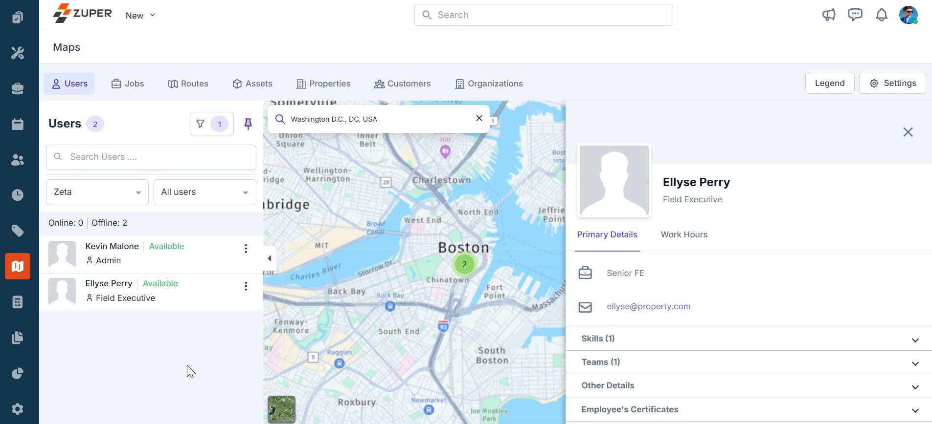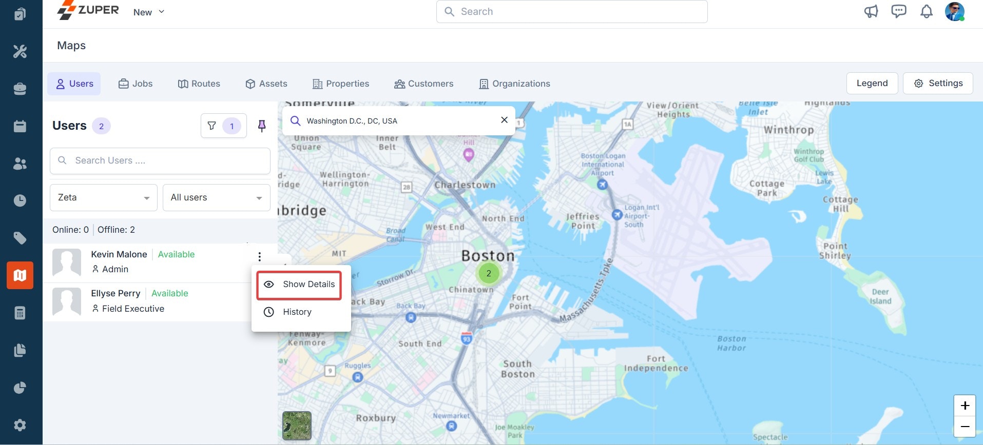- To view any user details and location history, click the “Kebab” icon next to the user and select “Show Details.” You can view the user details such as their role, email ID, phone number, skill set, team, work hours, and so on data on the right.