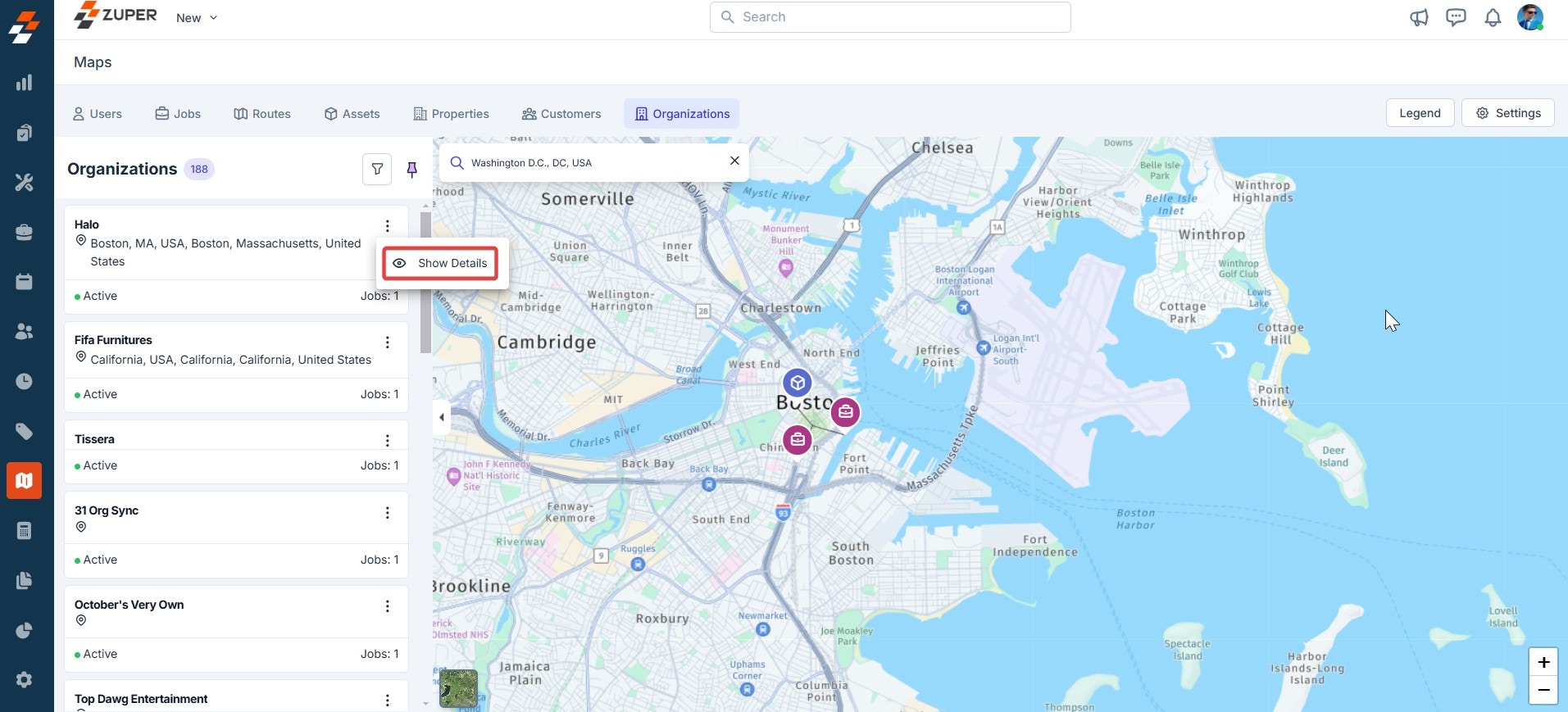 - To view any organization details, click the “Kebab” icon next to the organization and select “Show Details.” The organization details, such as address, associated customers, jobs, and other data, are displayed on the right.