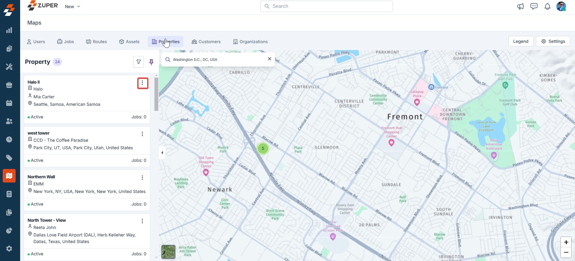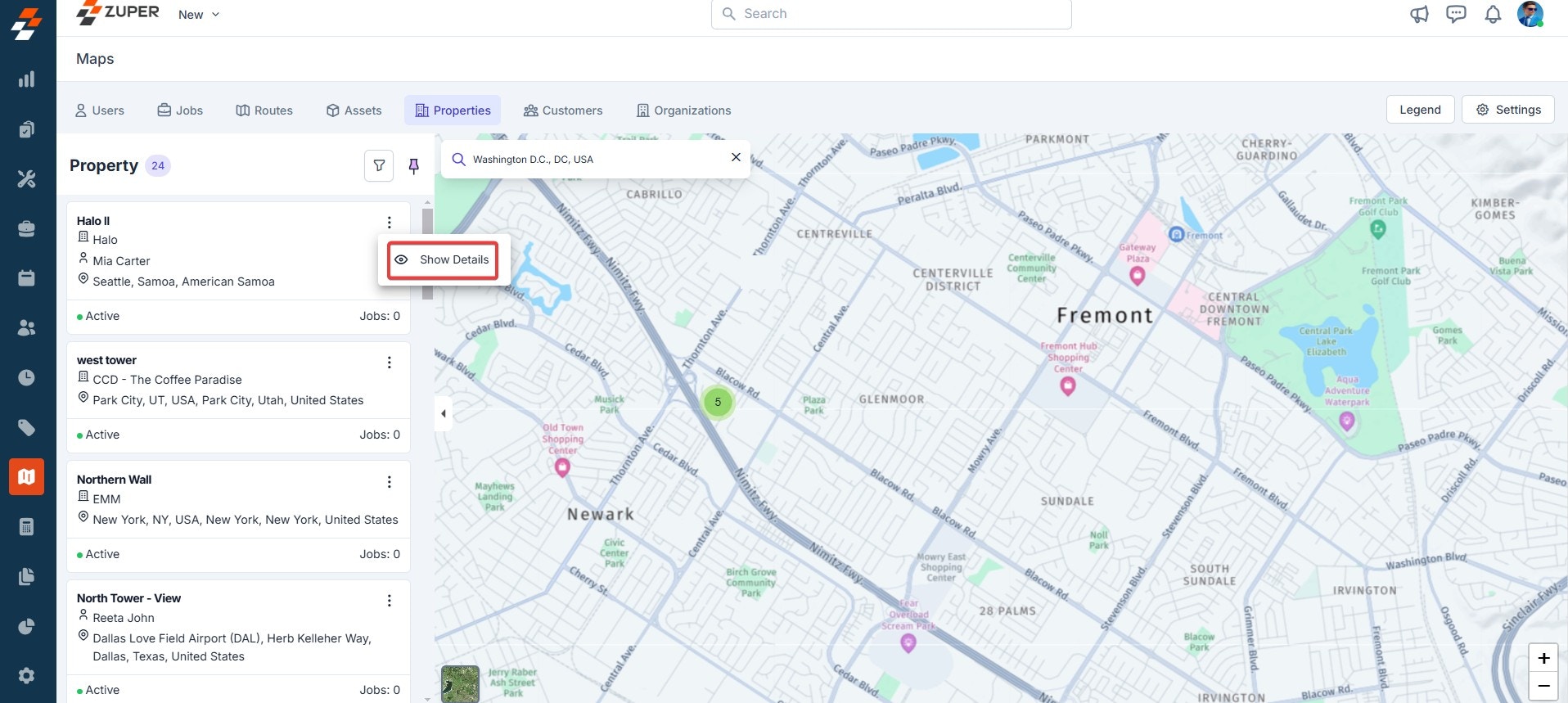 - You can also search and view specific properties. To search for a property, click the “Filter” icon. To view the property’s details, click the “Kebab” icon next to the property and select “Show Details.” You can view the property details such as property location, the number of jobs associated with the property, and so on.