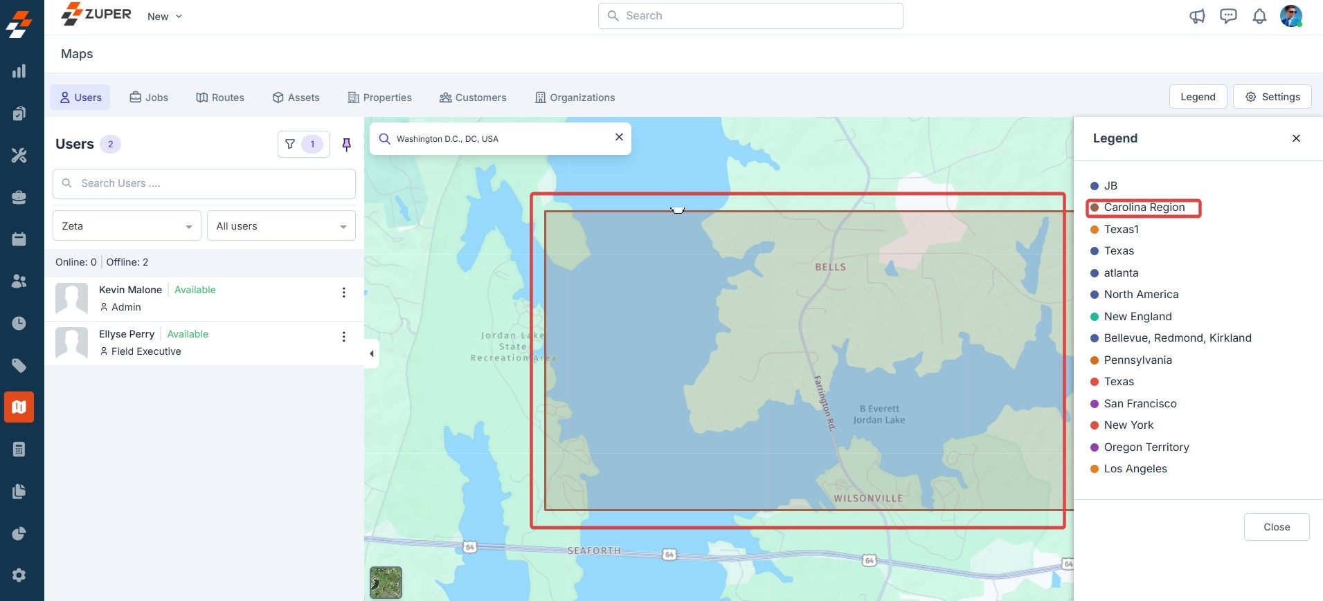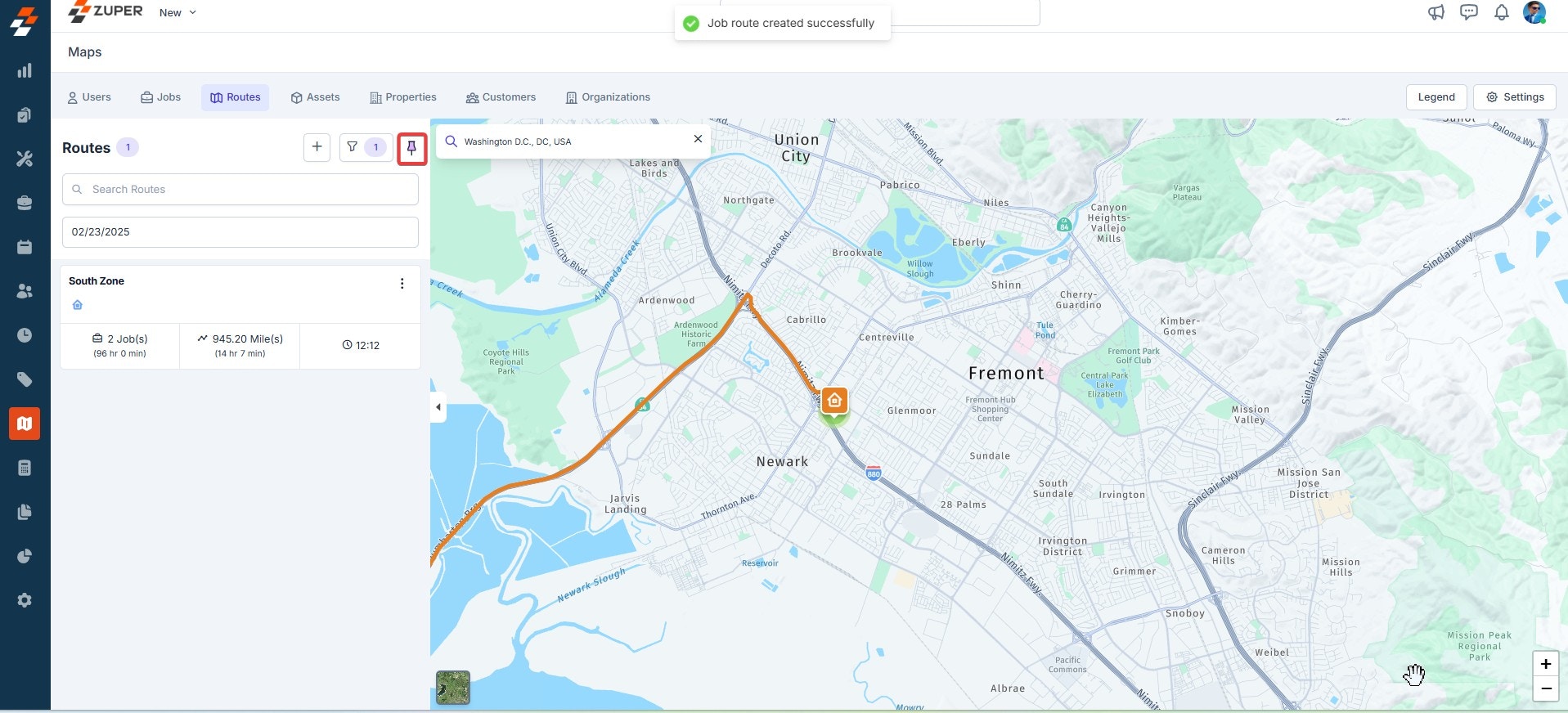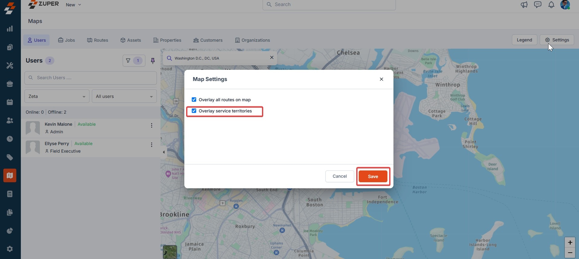 - Overlay service territories- When this is selected, you can view the territories where the routes and jobs are carried out efficiently on the map. Once selected, click the “Save” button to confirm.