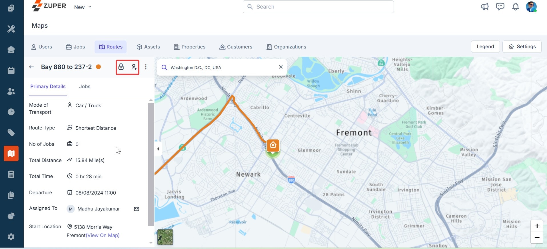 - On the maps page, click “Routes” at the top, which lists all the routes created. Click any of the routes to view the exact location on the map. You can use the zoom-in and zoom-out icons to adjust the map view.