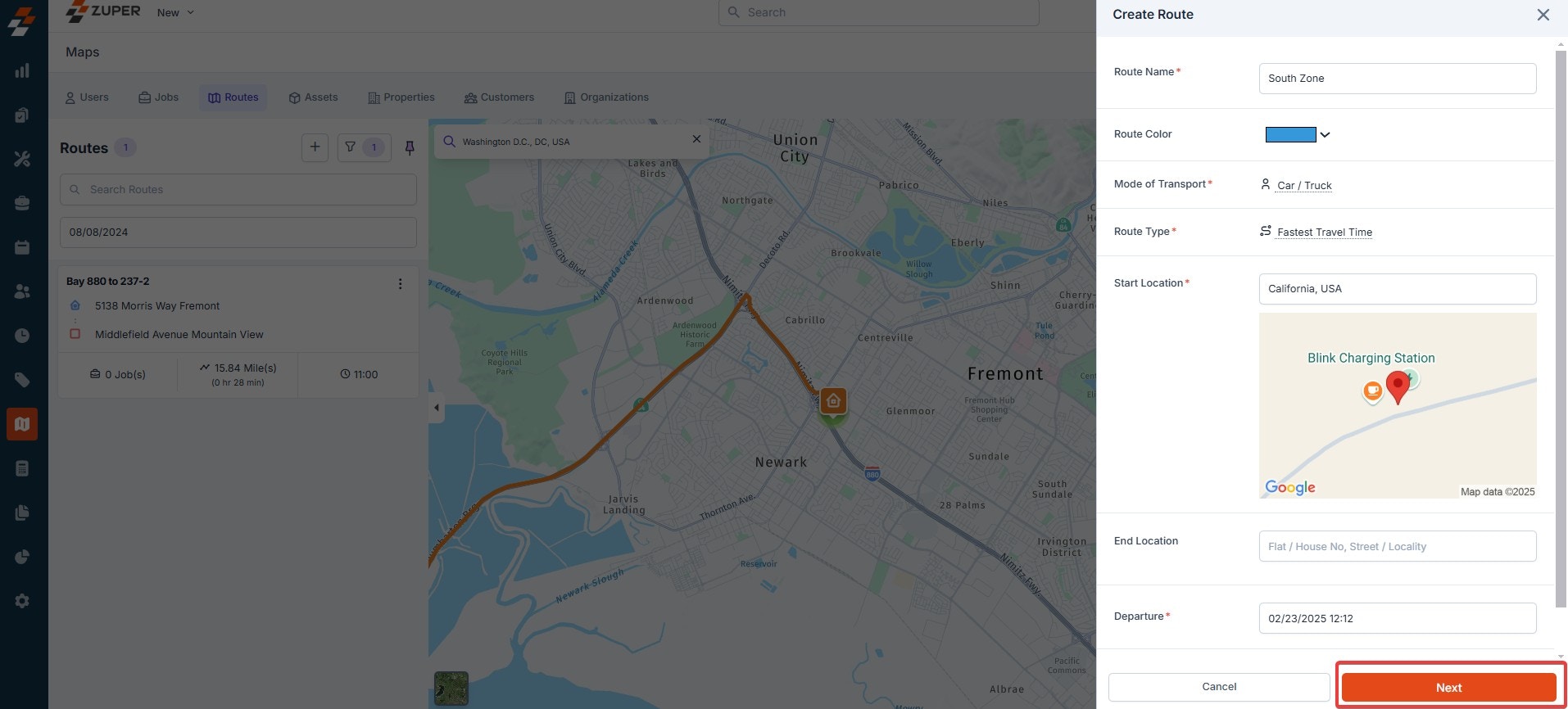 - Route type - Choose the route type (Fastest travel time or shortest distance) that the technician needs to follow. Start Location- Pick the location from where the route would start. End Location- Pick the location where the route ends.