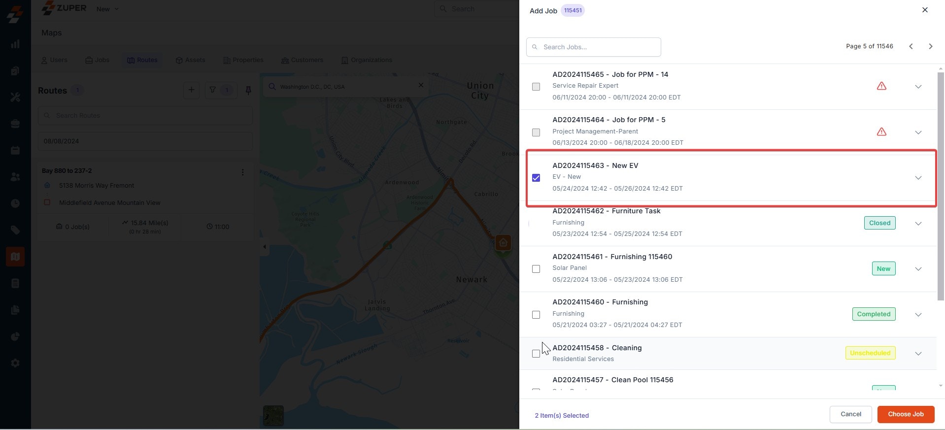 - Select the Jobs to be added and click the “Choose Job” button to add them to the route.