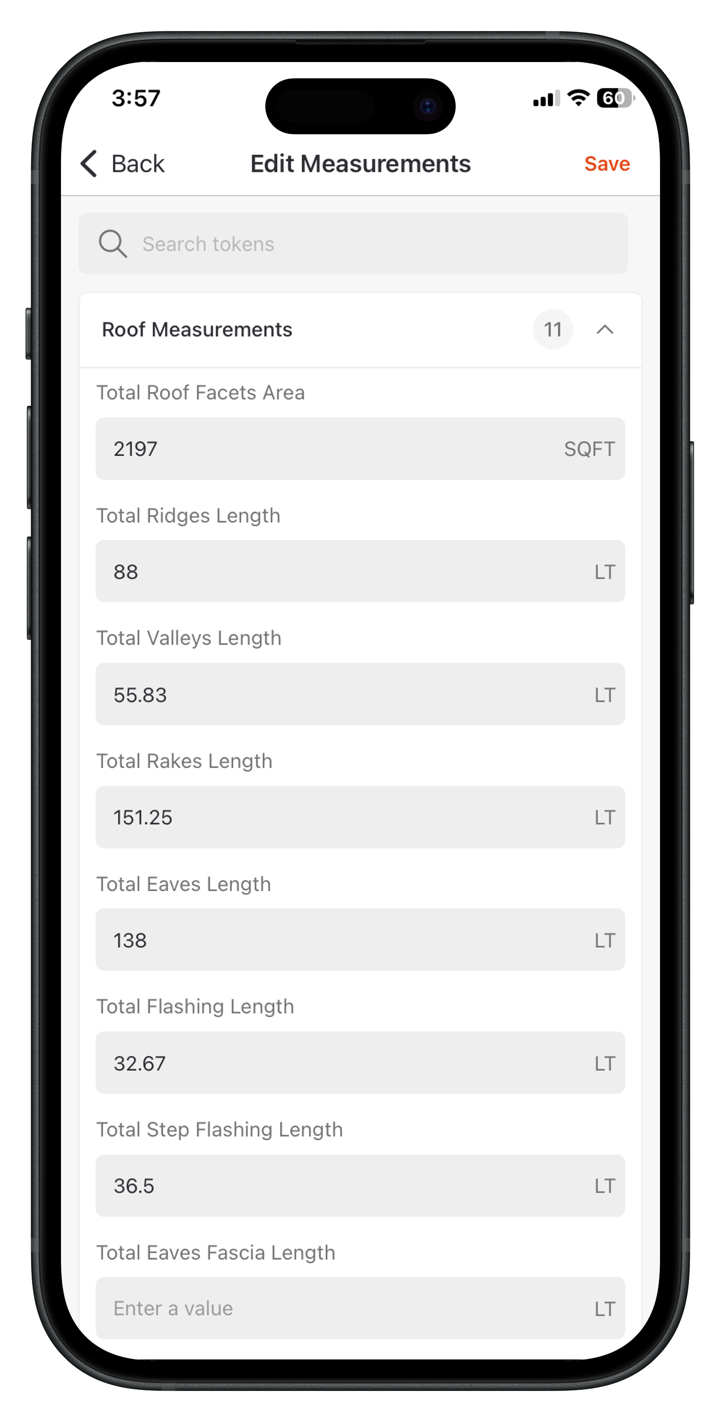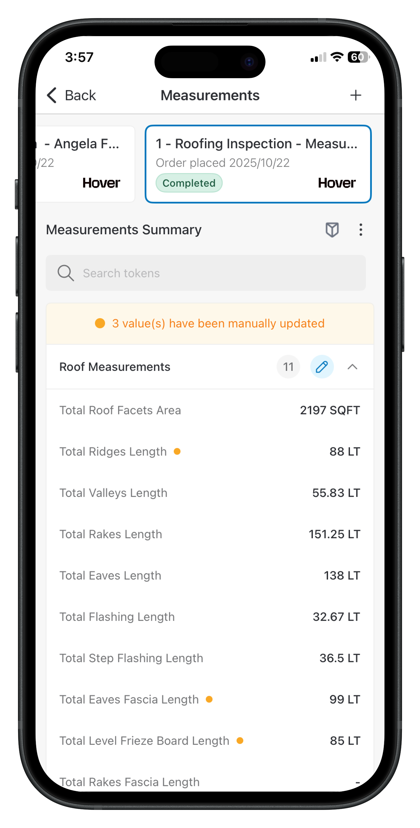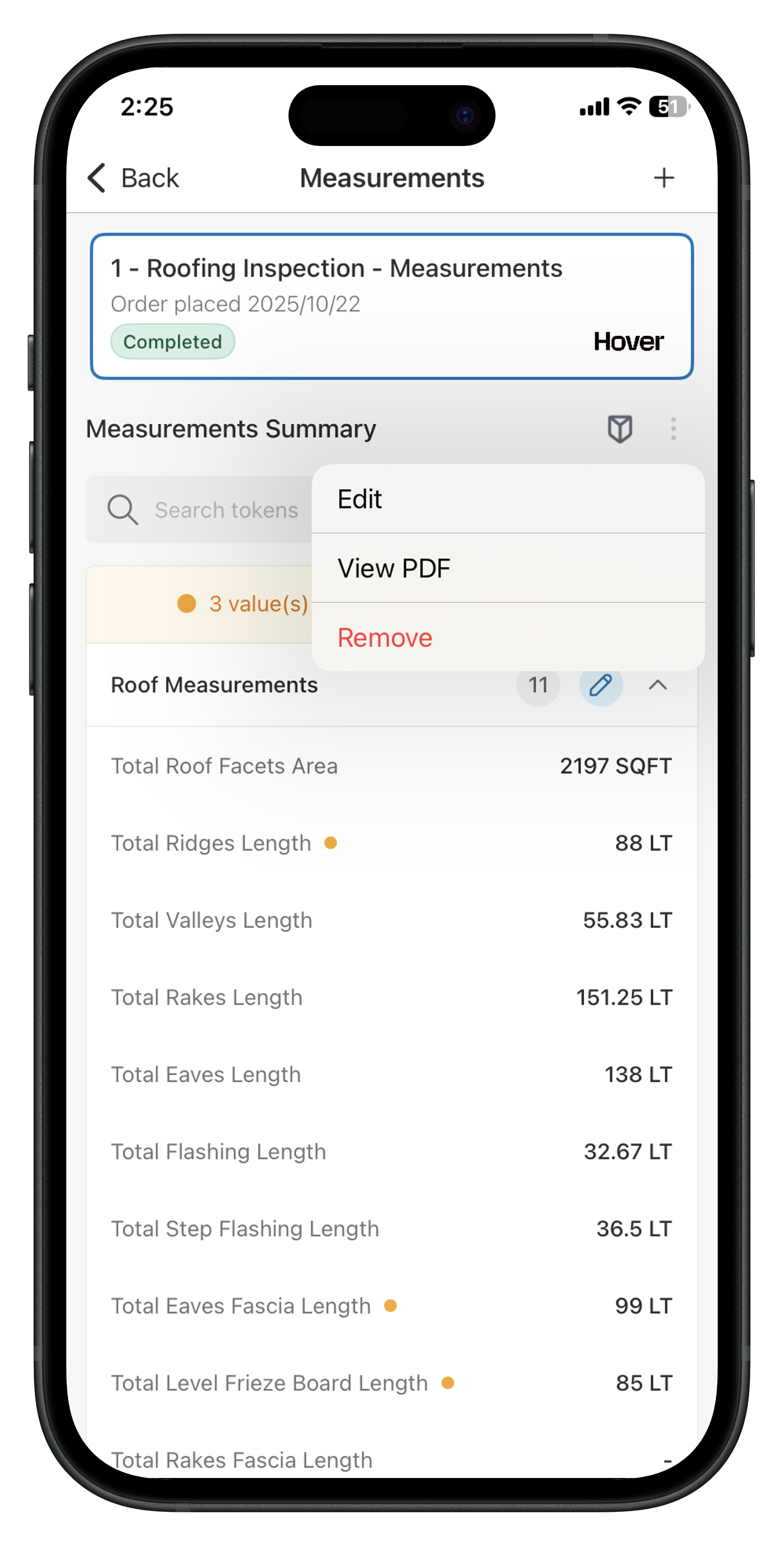 Once synced, view summaries directly on your mobile device, with options to search and filter tokens. Steps- In the job, go to the Measurements section.