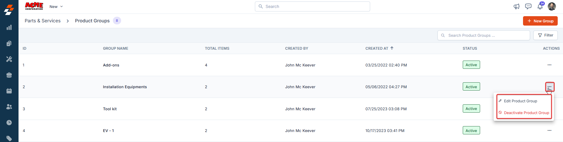 To edit or deactivate a Product/Item Group, follow these steps:- Navigate to the Product/Item Group Listing page.