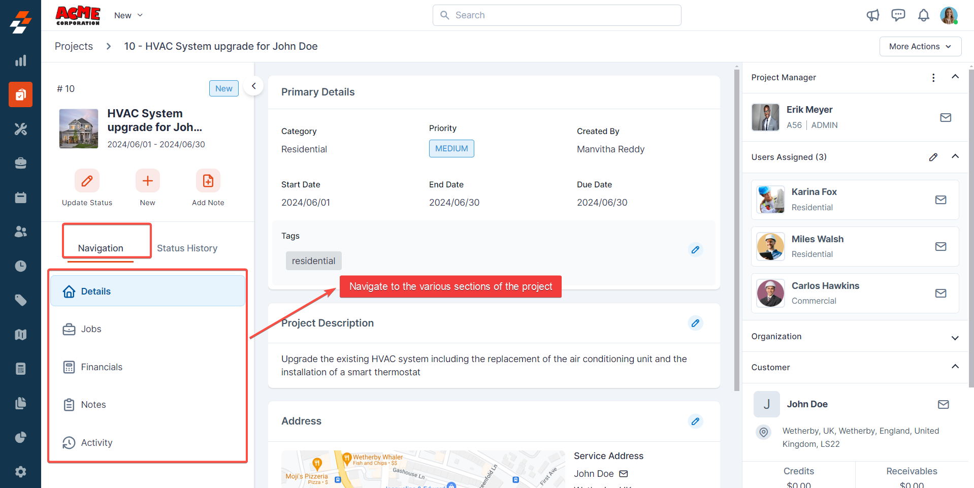 Once a project is created or accessed from the listing page, the Project Details Page serves as your central hub for managing its lifecycle. The details page has a three-column layout, providing quick access to information and actions within each panel access to view information such as project details, associated notes, parts & services, jobs, and activities.Left Panel