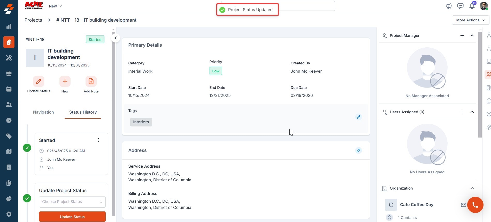 Project statuses are stages/checkpoints within a project that field technicians and other back-office users, such as dispatchers and supervisors, can update.