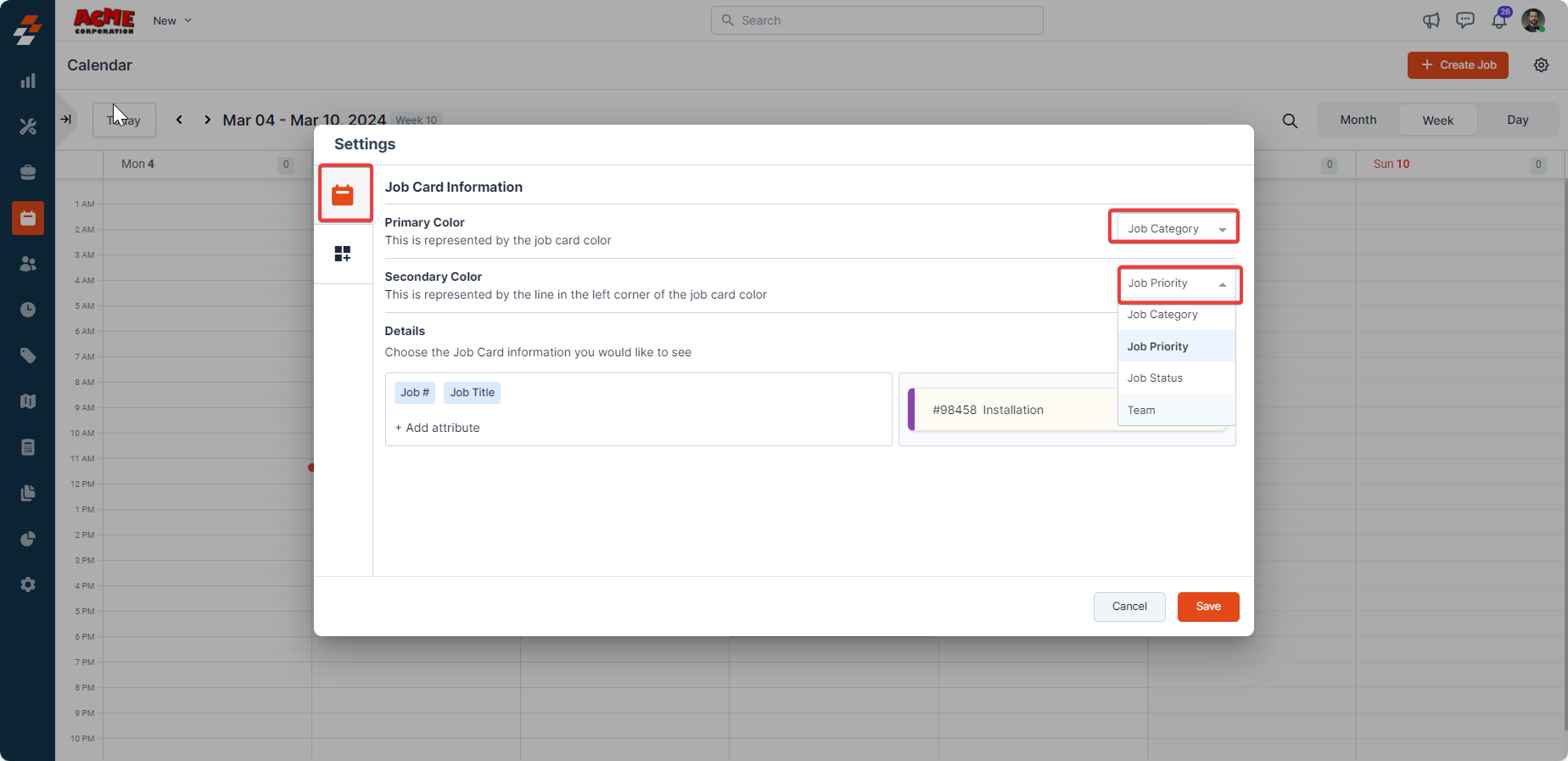 The settings in the calendar module allow you to customize its display and job card details for a better user experience.Job card information