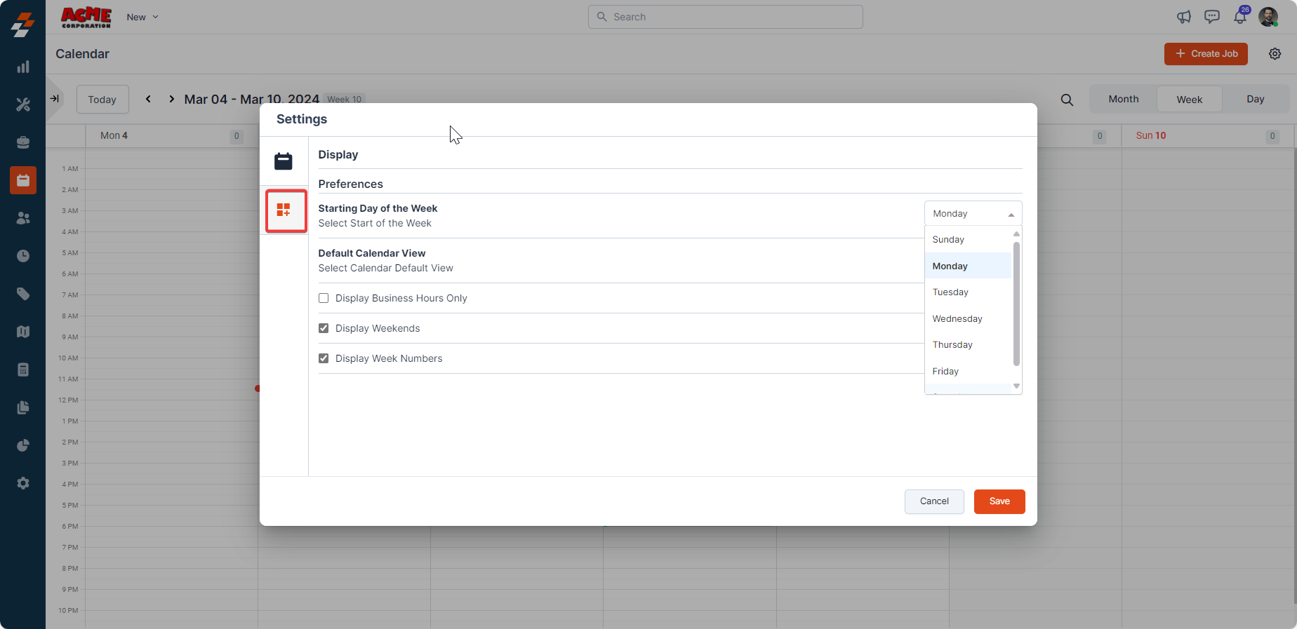 - Week Numbers: When enabled, week numbers are included in the calendar to schedule a job.