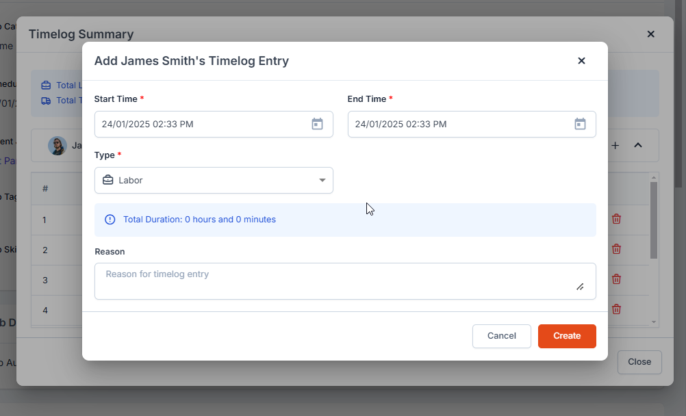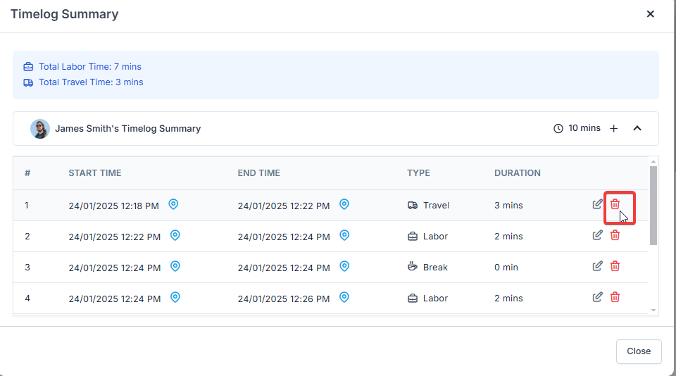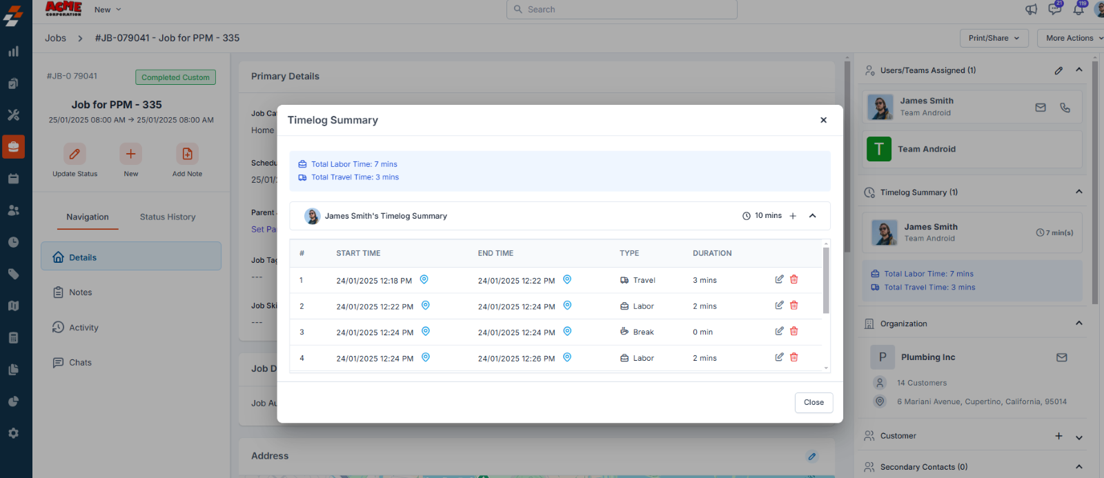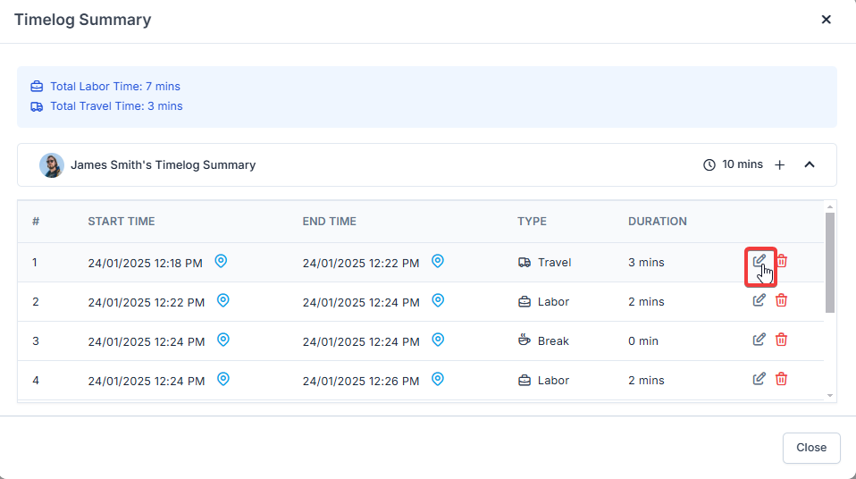 Skip to main contentYou can view the time logs of all users/technicians who have worked on a job, providing a detailed record of each user’s labor hours, travel time, and breaks spent on assigned tasks. This view helps track the time spent at each job stage and provides a clear picture of the total time logged. You can also manually add, edit, or delete time log entries for users/technicians who missed clocking in or out.