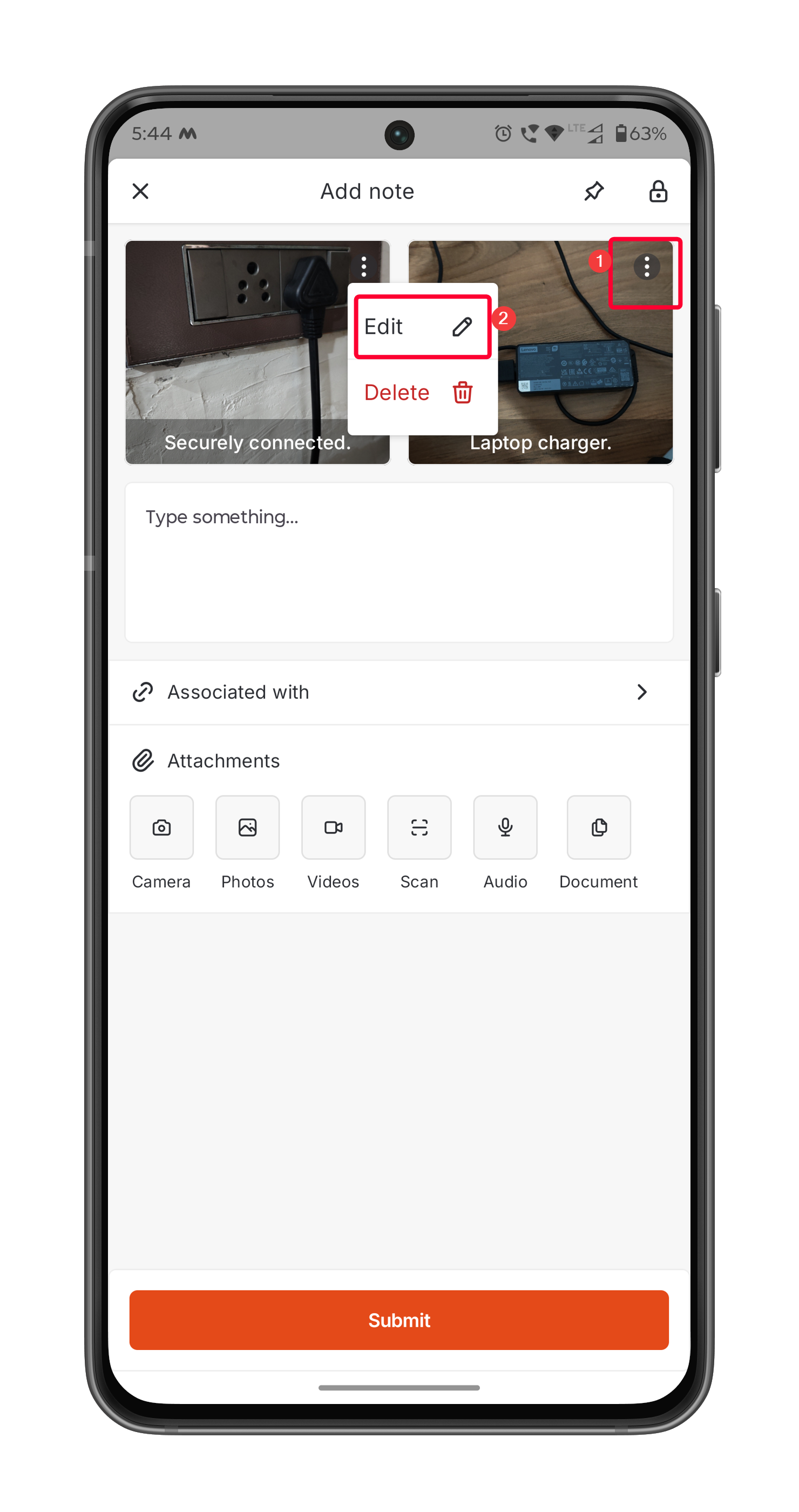 - Review the description tagged to the captured image, then click Attach to add the image with its description to the note.