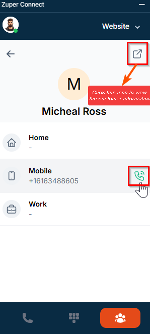 During an active call, Zuper Phone provides advanced functionalities to enhance communication efficiency. This includes:- Viewing Customer Information – If the customer already exists, click the icon to navigate to the Customer Details page.