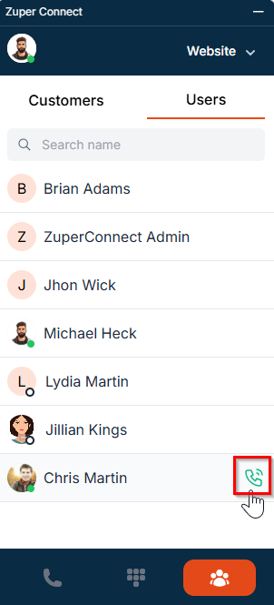 - Click the Users tab to view internal team members who have access to Zuper Phone. To search for a user, enter their name in the search bar.