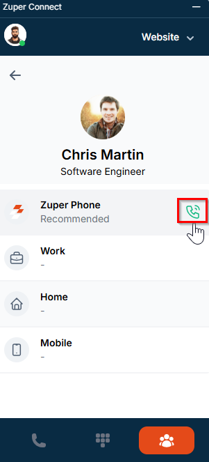 Tip: If you have multiple Zuper Phone numbers, select the one before calling from the top of the Zuper Phone interface. The chosen number will appear as the caller ID during the call, ensuring professional and seamless communication.