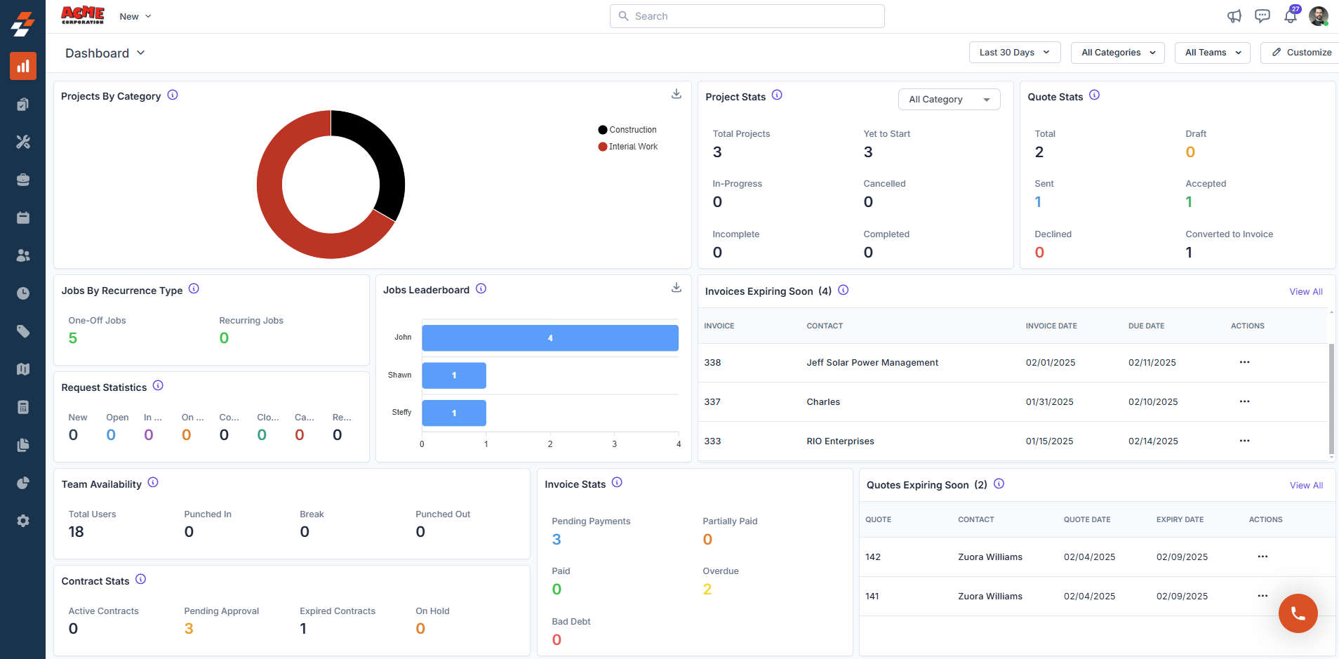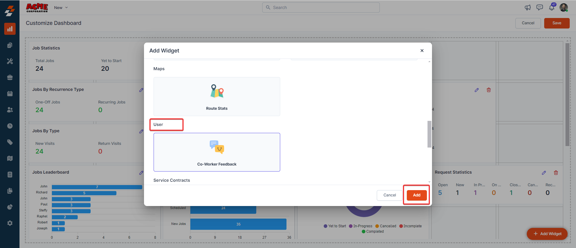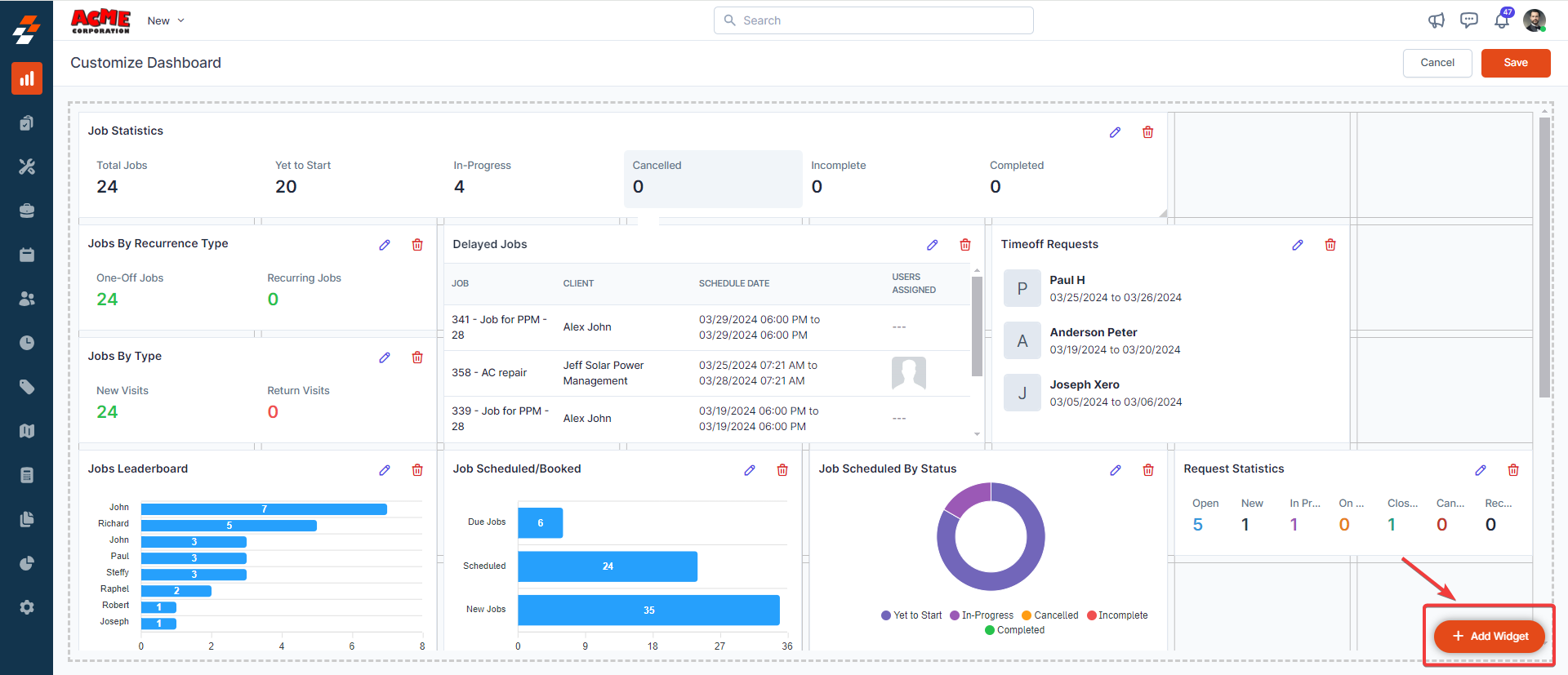 - Choose from a variety of widget options (e.g., Job Statistics, Timeoff request, or invoice).